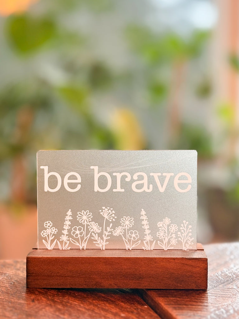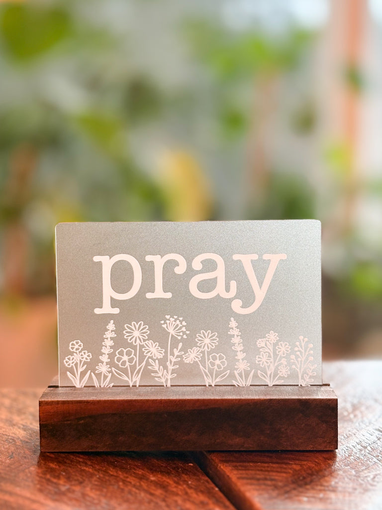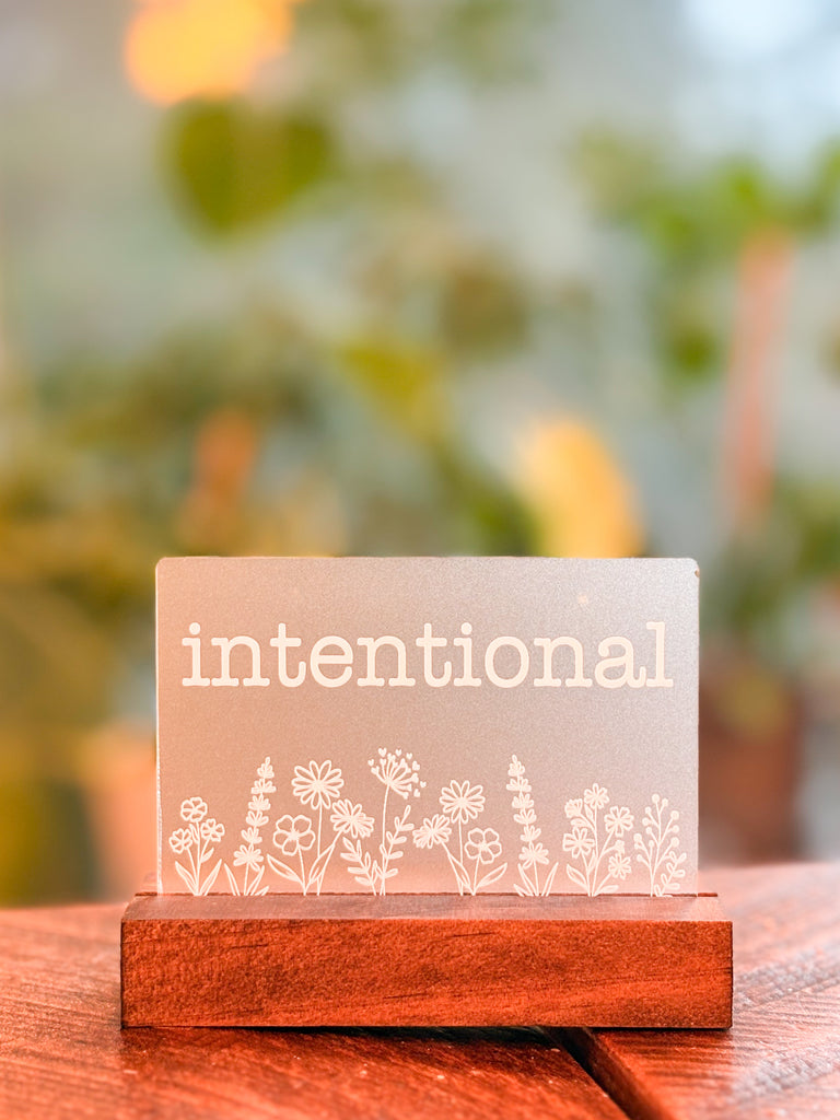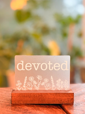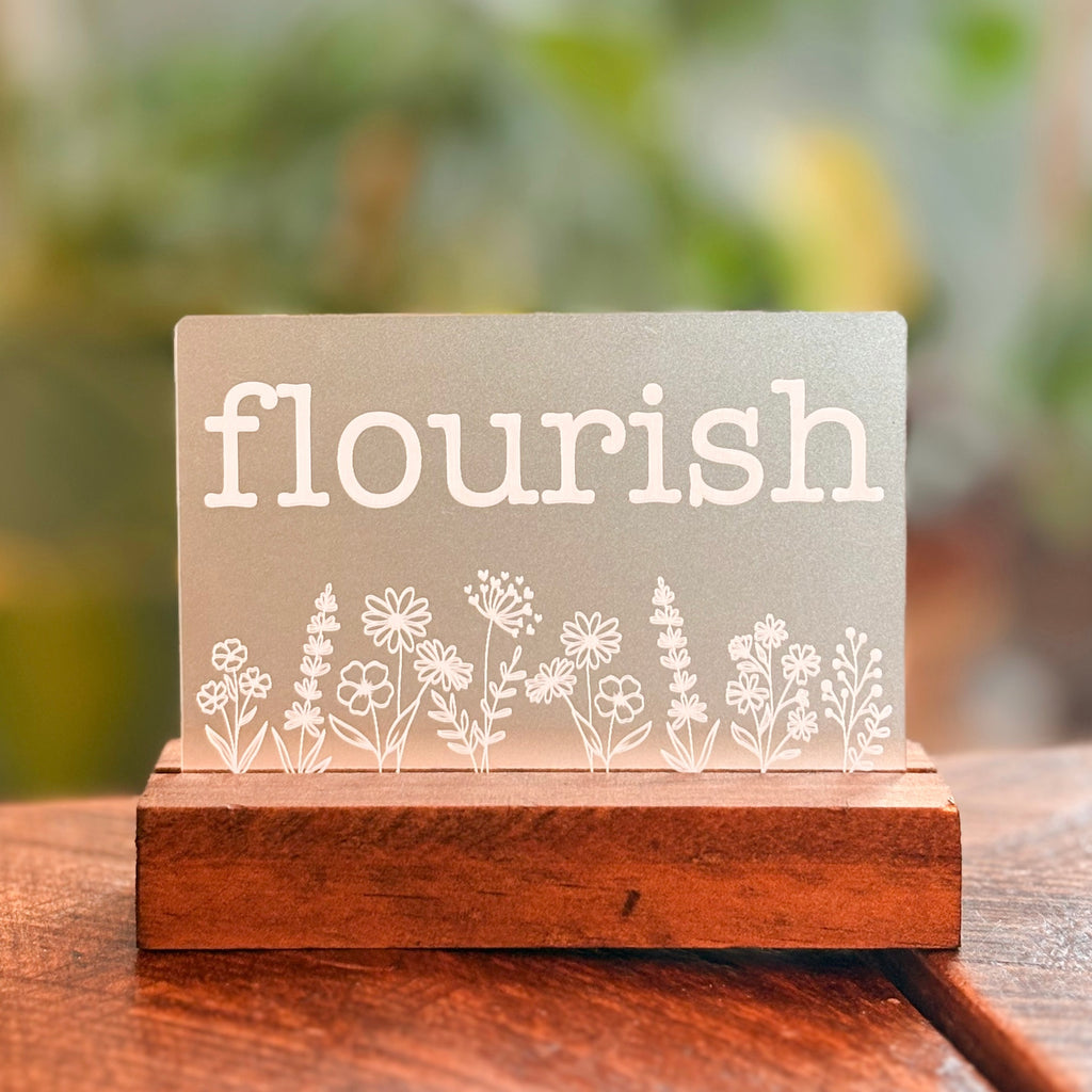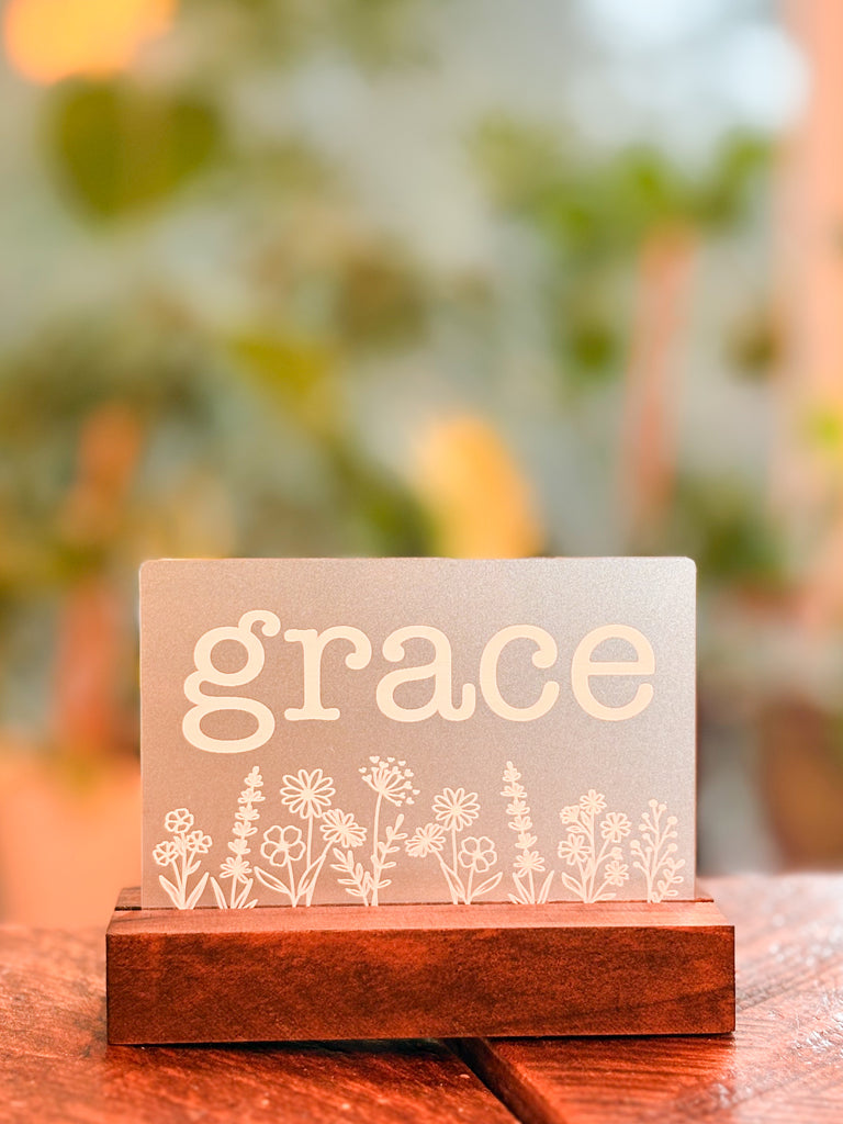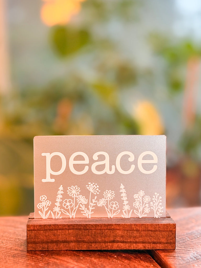 Engraved One Little Word shelf sitter. Each laser engraved piece is made of opaque acrylic and measures approximately 4.75" wide, and 3.75" tall. An oak base is included.